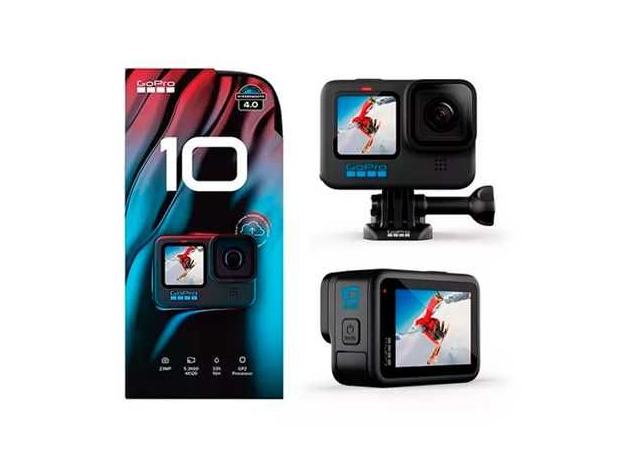 Incluye una cĆ”mara HERO10 Black, una bolsa de transporte, una baterĆa recargable, soportes adhesivos curvos, una hebilla de montaje, un tornillo, un cable USB-C y una tarjeta SD gratuita.